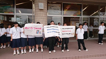 中学生の力で地域を元気にしようと始めた「あいさつWeek」。全校生徒のあいさつ合計は75,571人でした。目標としていた50,000人を大きく超えました。