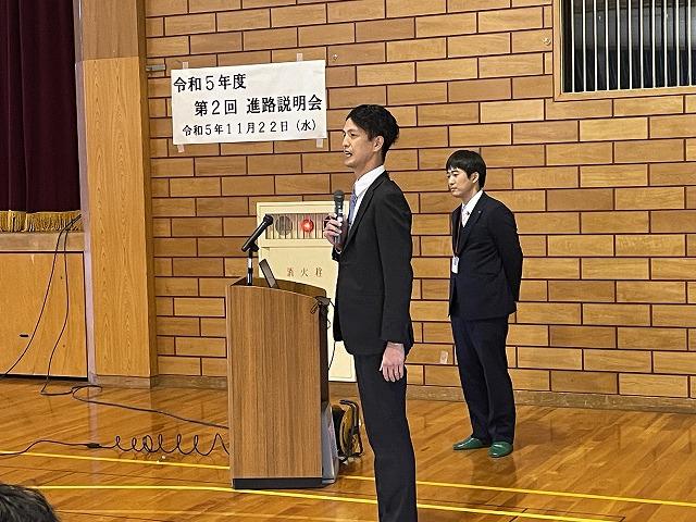 11/22(水)の5・6限に本校体育館で進路説明会を行いました。本校の進路指導主事から志望校決定までの流れや留意点等について話をさせていただきました。