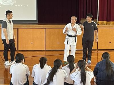 3年生体育では、スポーツ庁の事業「武道等指導力向上事業」で、空手道と柔道について外部指導者の方に直接、生徒を指導していただく授業を行っています。9/9(月)から12(木)の4日間、北國空手道松涛館会長の関原先生に来ていただき、3年生全学級を2時間ずつ、指導していただきました。生徒たちは慣れない動きに苦戦しながらも、楽しく取り組んでいました。関原先生、熱心にご指導いただき、ありがとうございました。