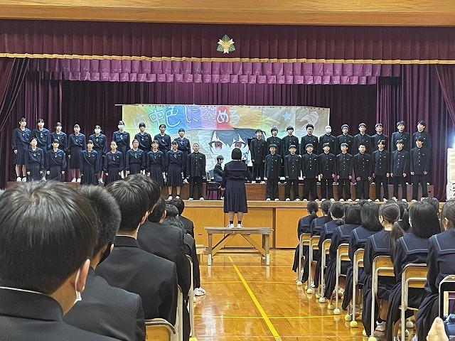 11/6(月)の午後、河北台中の講堂で行われた郡市音楽会に、先日の合唱コンクールで最優秀賞を獲得した2年1組と3年4組が参加しました。
