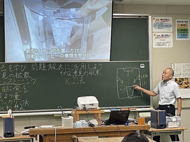 大手コンビニエンスストアではコーヒーの注文の際、以前はお客さんのボタンの押し間違えがよくあったそうです。授業では、その解決のためのアイデアを生徒たちが自由に出し合いました。生徒たちは「お客さんではなく、店員さんがボタンを押す」や「センサーでカップの重さを量って識別する」、「AIにカップを覚え込ませる」など、たくさんのアイデアを出し合っていました。