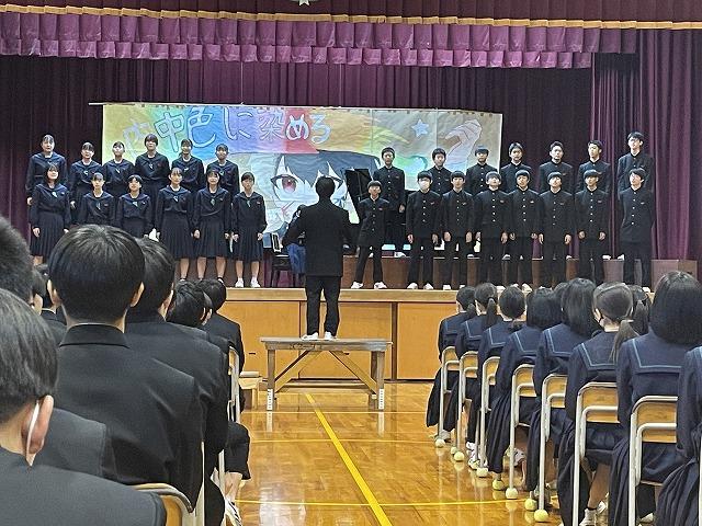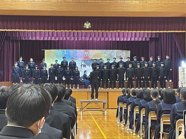 11/6(月)の午後、河北台中の講堂で行われた郡市音楽会に、先日の合唱コンクールで最優秀賞を獲得した2年1組と3年4組が参加しました。