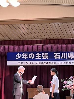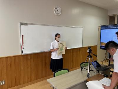 8/27(日)、県青少年総合研修センターで行われたこの大会に、本校3年生の石本千陽さんが出場しました。この大会は、県内各地区の予選を通過した生徒16名が参加して行われました。