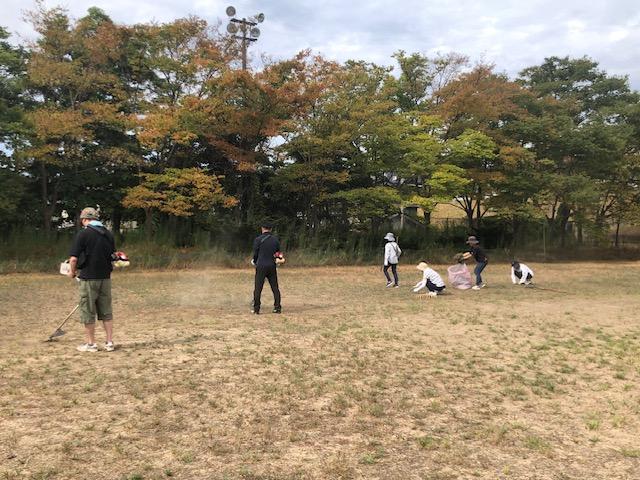 本日、PTA環境部・執行部の保護者の方々、中学校職員、女子ソフトテニス部の生徒、合わせて約50名でグラウンドの草刈りを行いました。
