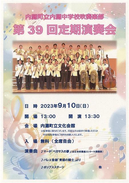 吹奏楽部は現在、定期演奏会に向けて頑張っています。3年生にとってはこれが最後のステージです。保護者・地域の皆さん、9月10(日)は内灘町文化会館で、生徒たちの心のこもった演奏を楽しんでいただきたいと思います。よろしくお願いいたします。