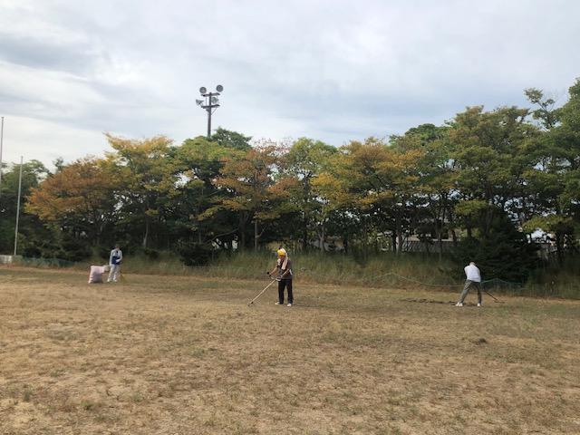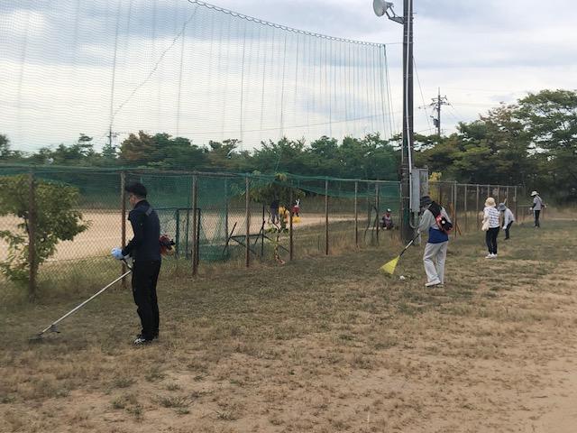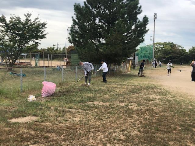 本日、PTA環境部・執行部の保護者の方々、中学校職員、女子ソフトテニス部の生徒、合わせて約50名でグラウンドの草刈りを行いました。