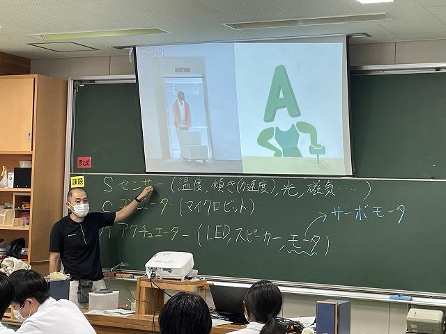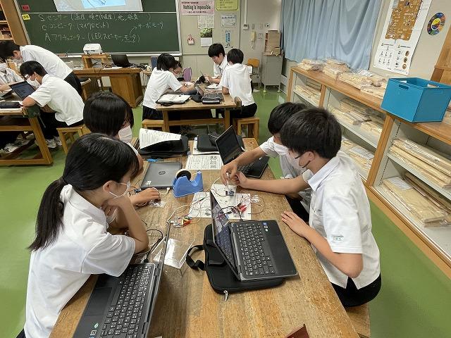 3年生技術の授業では、S:センサー(温度・傾き・光 等)、C:コンピューター(マイクロビット)、A:アクチュエーター(LED・スピーカー・サーボモーター 等)について実際にプログラミングをしながら学んでいます。この仕組みは身のまわりの様々な場面で使われているそうです。