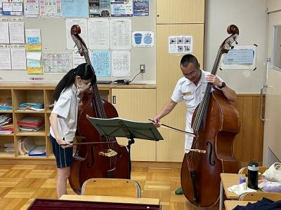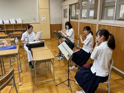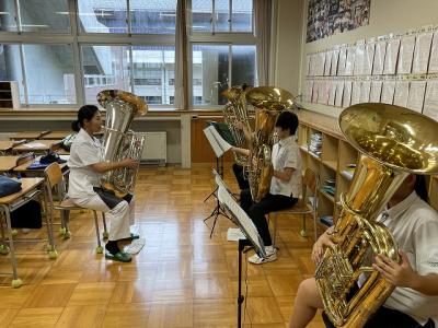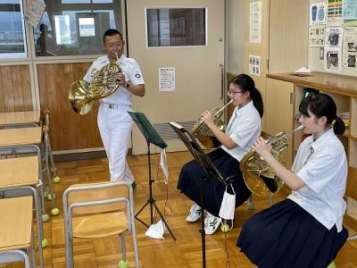 はじめに生徒たちの合奏を聴いていただき、その後、各パートに分かれてレッスンをしていただきました。音楽隊の皆さまによる熱心なご指導に応えようと、生徒たちも一生懸命に演奏しました。