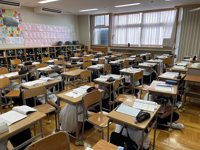 7/11(火)11:00に県民一斉防災訓練を行いました。3限目の授業中、町のスピーカーによる地震を想定した避難指示に従い、生徒たちは一斉に机の下に入る避難行動をしていました。写真は3年生数学と3年生少人数英語の様子です。