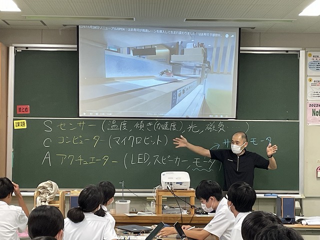 3年生技術の授業では、S:センサー(温度・傾き・光 等)、C:コンピューター(マイクロビット)、A:アクチュエーター(LED・スピーカー・サーボモーター 等)について実際にプログラミングをしながら学んでいます。この仕組みは身のまわりの様々な場面で使われているそうです。