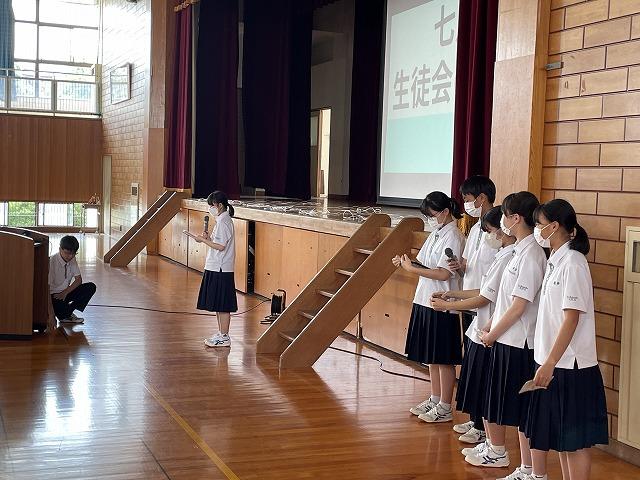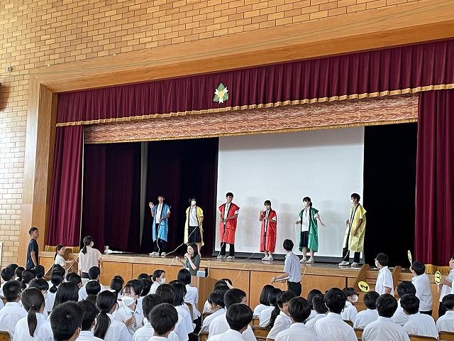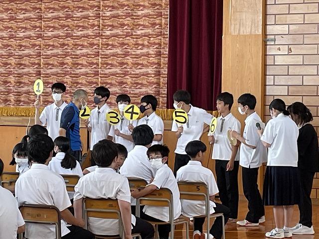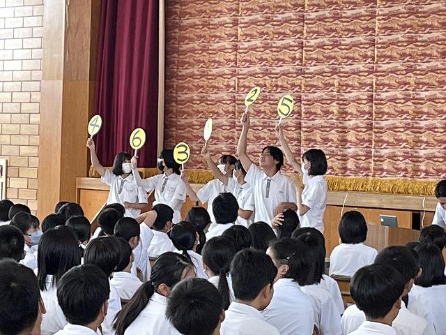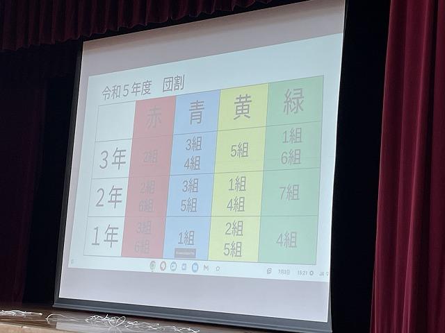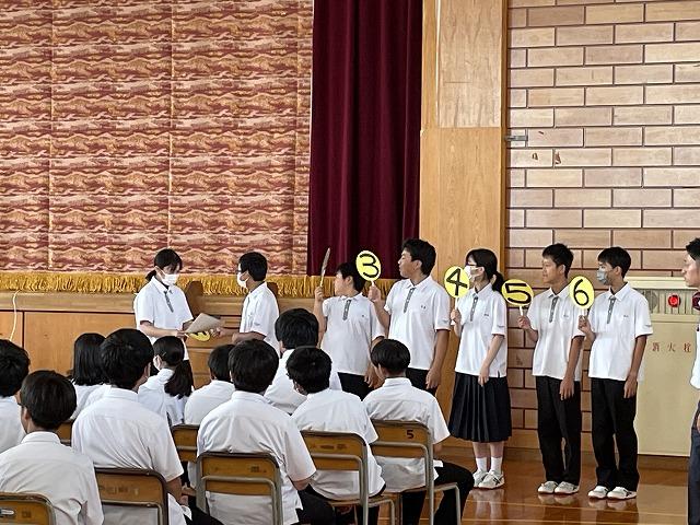 続いて生徒会から、専門員会からのお知らせの後、9月に行われる体育祭の団決めの抽選会を行いました。生徒会執行部の工夫により、とても盛り上がりました。