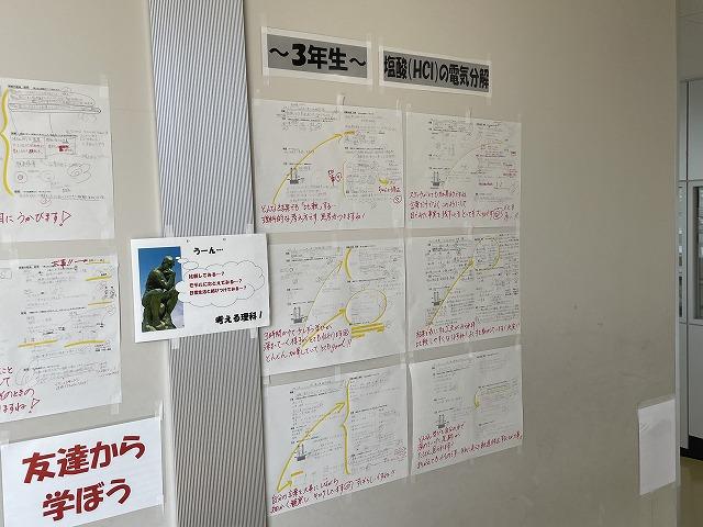 理科の授業では、実験後にレポート作成に取り組んでいます。何点かのレポートについて、「不足している部分をどんどん書き足して、実験中(授業中)、良く思考している様子がわかります」など、それぞれの優れている部分について先生がコメントを添えて掲示しています。