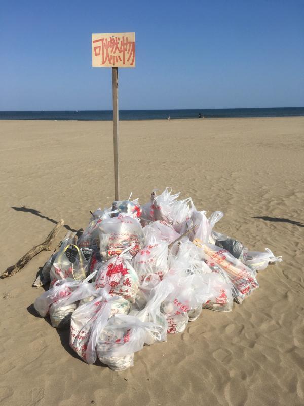 ●5月29日(日)の第41回内灘町海浜美化清掃に、内灘町中高生ボランティア倶楽部「ZERO」に所属する生徒たちが参加しました。参加した方々に拾ったごみを入れる袋を配りました。