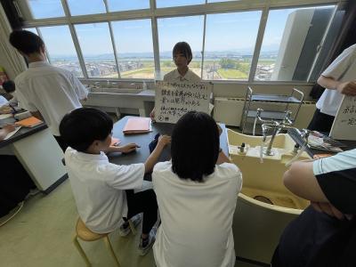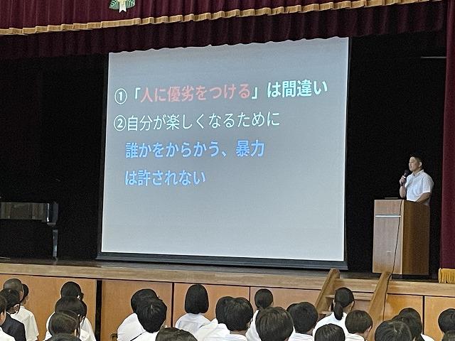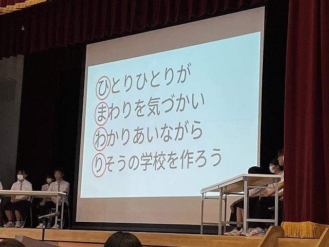 代表の生徒たちは、全員しっかりと準備をして、立派な説明をしてくれました。代表の生徒たちの気持ちに応え、全校生徒もしっかりと聴いていました。6限目は各学級で「いじめ撲滅」に向けた取組を話し合います。