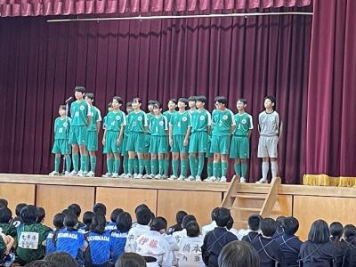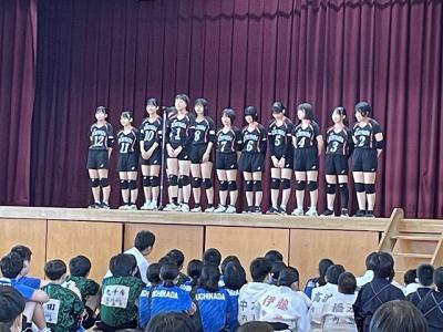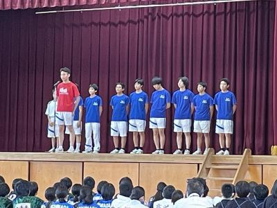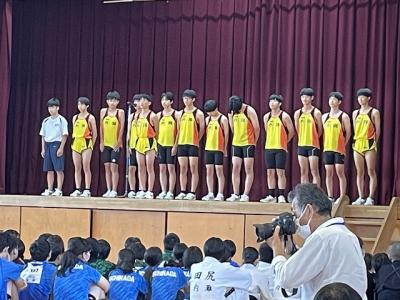 6/5(水)の午後、今週末から始まる大会の壮行会が行われました。選手たちは吹奏楽部の演奏をバックに入場しました。各部キャプテンの力強い言葉の後、生徒会長の激励の言葉、選手代表の男子陸上部キャプテン:北川さんのお礼の言葉がありました。周囲への感謝の気持ちを込めること、何より楽しむことを大切にしてプレーしてほしいと思います。ガンバレ内灘中生!