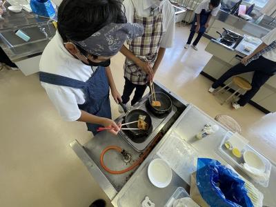 生徒たちは、チョコ味とチーズ味の蒸しパンを1つずつ作りました。できたての蒸しパンは、とっても美味しそうなにおいです。調理から片付けまで、生徒たちは協力して行っています。