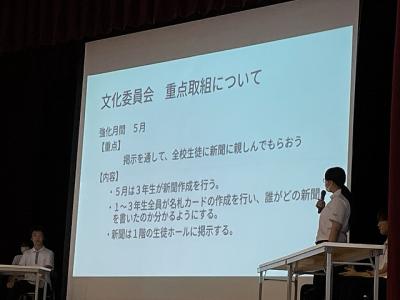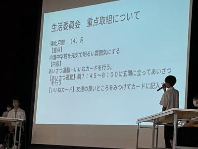 6/7(金)の5限目に生徒総会を行いました。生徒会執行部・専門委員長、各学年代議員会の代表生徒による前期の活動計画等についての説明がありました。また、生徒会執行部から、いじめ撲滅に向けて「ひまわりプロジェクト」の説明がありました。
