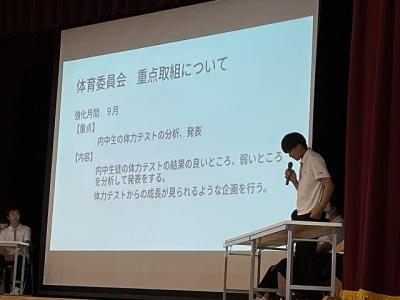 体育祭スローガンが決まりました。生徒会執行部から「全校生徒が団結して全力で取り組み、素晴らしい体育祭にしよう。」という呼びかけがありました。