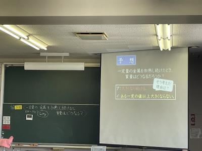 2年生理科「一定量の金属を加熱し続けたとき、質量はどうなるだろうか」実験結果の予想を、既習事項をもとに考えていました。