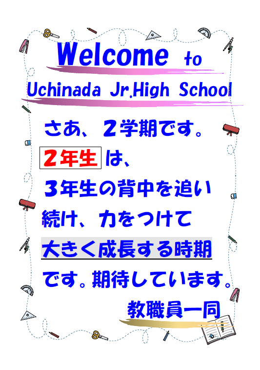 2学期スタート! 教職員からのメッセージを生徒玄関に掲示しました 投稿日時 : 2020/08/18 教職員 今年は、新型コロナウイルス感染拡大に伴う対応として、夏休みが10日間と、例年に比べ大変短くなりました。本日、8月18日から2学期をスタートするにあたり、全教職員から全校生徒へ、「苦しい時だからこそ、みんなで一緒に頑張って乗り切っていこう。」という思いをこめて、生徒玄関に登校する生徒へメッセージを掲示しました。 ↓ 〈各学年へのメッセージです〉 ↓ 〈各学年の生徒玄関に掲げられたメッセージの写真です〉 Tweet {{options.likeCount}} {{options.likeCount}}