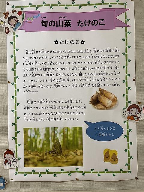 4/30(火)の給食は、旬の山菜「たけのこご飯」でした。とっても美味しかったです。
