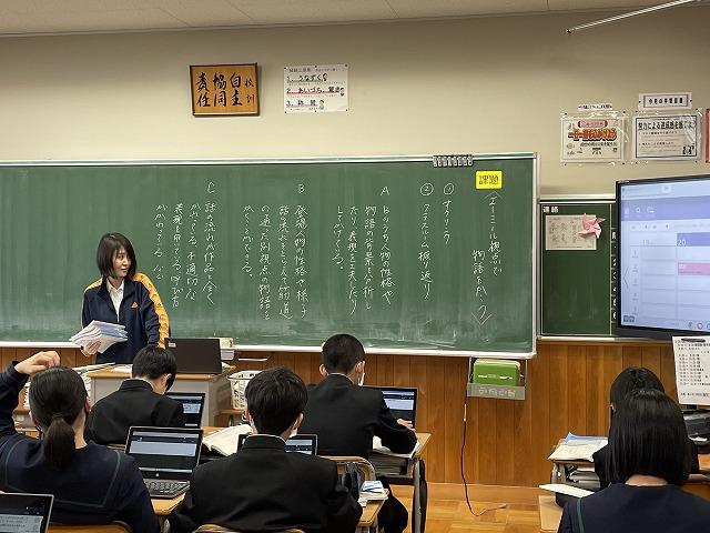 1年生国語では、ヘルマン・ヘッセの短編小説「少年の日の思い出」について学習しています。生徒たちは、『ぼく』の視点でかかれている物語を、『エーミール』の視点でかき直すことに挑戦しています。難しい課題ですが、生徒たちは頑張っています。