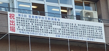 3月31日に埼玉県で行われる「第8回首都圏学校交歓演奏会」に出場する吹奏楽部の健闘を祈り、横断幕が掲げられました。