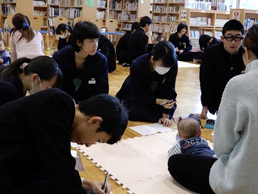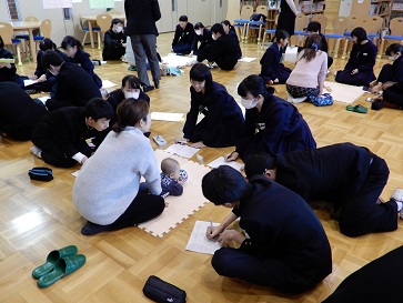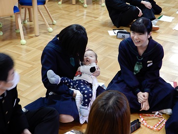 本校の家庭科の授業では、子育て支援センターのご協力のもと、「赤ちゃんとママから学ぼう」の講座を実施して、今年度で7年目になります。実際に赤ちゃんを抱いたりしたり、お母さんの話を聴いたりすることで、命の大切さや親の愛情、これからの自分のあり方について考えることをねらいとしています。