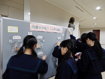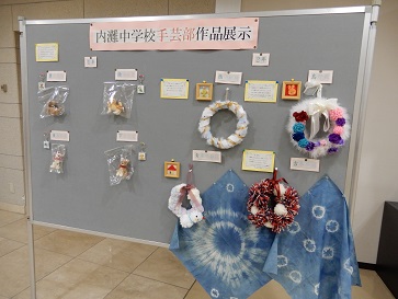 本日、手芸部の生徒が、自分たちの作った作品を展示するため内灘町役場ロビーで作業を行いました。