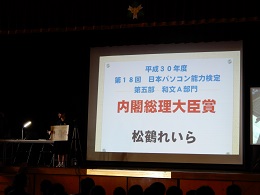 第18回毎日パソコン入力コンクール全国大会(毎日新聞社・一般社団法人日本パソコン能力検定委員会主催、公益社団法人全国珠算教育連盟共催、総務省・文部科学省・厚生労働省・経済産業省など後援)が9日、東京都渋谷区の国立オリンピック記念青少年総合センターで行われました。このコンクールは、パソコン入力の正確さと速さを競うもので、地方予選には全国から約7万7000人が参加。全国大会には上位に入った139人が進み、本校2年の松鶴れいらさんが見事、最高位の「内閣総理大臣賞」を受賞しました。おめでとうございます。