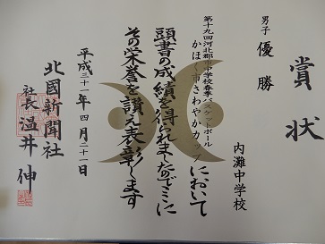 先月27日に第7回首都圏学校交歓演奏会(東京都府中市で開催)において金賞を受賞した吹奏楽部が10日、内灘町役場を訪れ、川口町長、久下教育長に受賞報告を行いました。