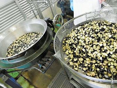 本格的なマーボーなすにするため、食べやすく切ったを素揚げしています。