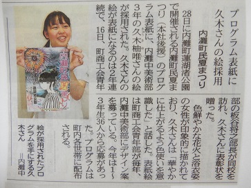 今年の内灘町民夏まつりのプログラム表紙に、久木柚唯さん(美術部・3年)の作品が昨年に引き続き採用されました。おめでとうございます。