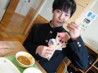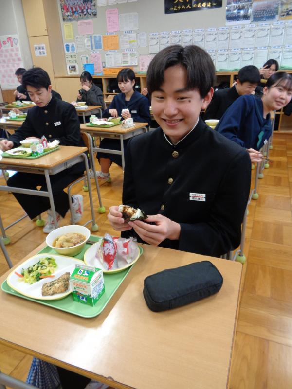 3年生が公立高校受験に備え明日から臨時休校となるため、3年生のみ急きょ献立を変更し、米心石川さんから「受験応援おにぎり チキンカツ」をいただきました。
