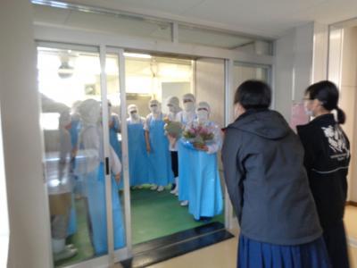 代表の給食委員さんから感謝の言葉とともに色紙が渡され、調理員さんからは色紙のお礼と卒業する3年生へのお祝いのメッセジがおくられました。