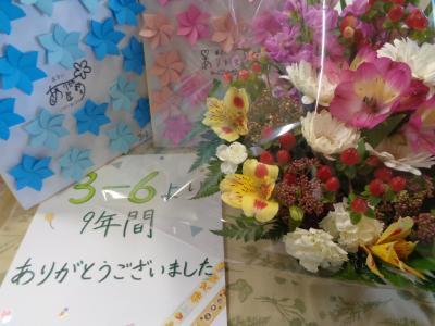 3年生の各クラスから調理員さんへ、9年間の感謝の気持ちのこもった素敵な色紙とお花が贈られました。