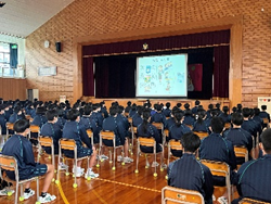 生徒たちは、税金の使い道や1億円の重さなどを体験し、興味深々で講演を聞いていました。