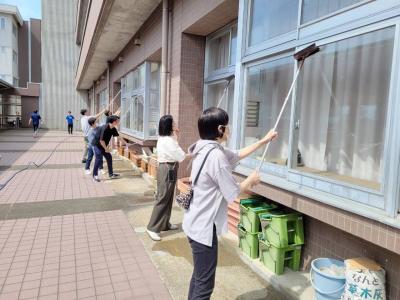 5月27日(土)の午前中、PTA環境部を中心にPTA執行部や教職員、生徒が参加して校舎の窓ふき清掃が行われました。新型コロナの流行前以来の久しぶりの開催ということで、かなり汚れていましたが、参加者のみなさんの熱心な作業で、とても美しくなりました。