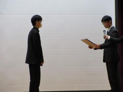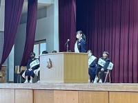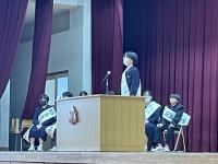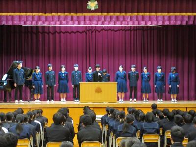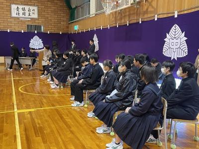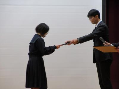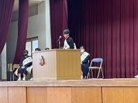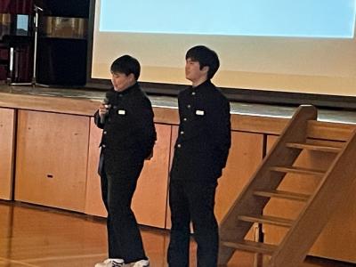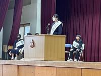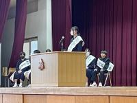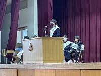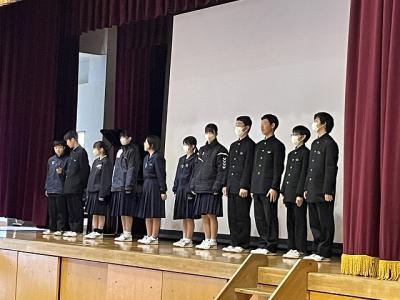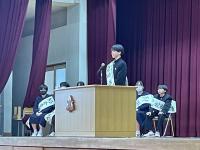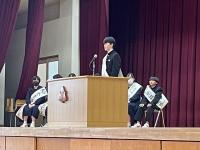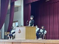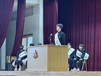 修了式では3月分の表彰伝達の後、「はまなす善行賞」に2年生の欠さんが、「はまなす努力賞」に1年生の百万さんが表彰されました。おめでとうございます。また、令和6年度前期生徒会役員の任命式の後、新生徒会長が抱負を語ってくれました。