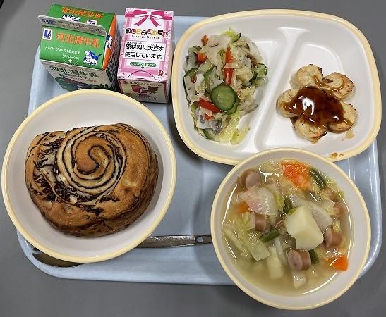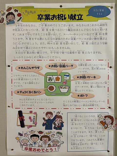 3/8(金)は卒業お祝い献立でした。花の形の豆腐ハンバーグやケーキなど、どれもとても美味しかったです。栄養教諭や調理員の皆さんが心を込めてつくってくれました。
