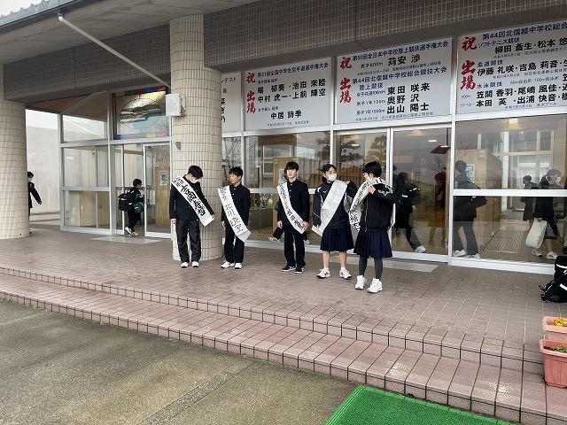 毎朝、令和6年度の生徒会役員選挙に立候補した生徒たちが、生徒玄関で登校してきた生徒たちに挨拶を行っています。3年生からリーダーのバトンを受けた2年生は力強く走り始めました。とても頼もしく感じます。