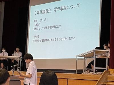6/7(金)の5限目に生徒総会を行いました。生徒会執行部・専門委員長、各学年代議員会の代表生徒による前期の活動計画等についての説明がありました。また、生徒会執行部から、いじめ撲滅に向けて「ひまわりプロジェクト」の説明がありました。