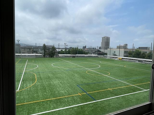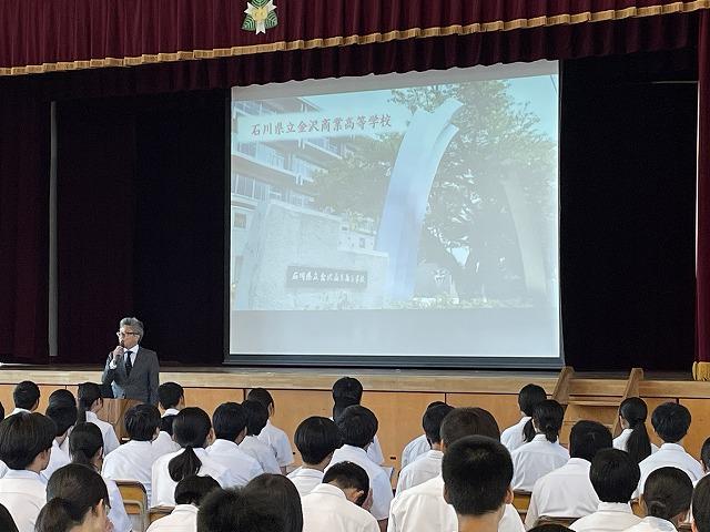 金沢西高校の生徒は部活動と勉強の両方頑張ることや近年、進学実績が上がっていることなどについて説明をしていただきました。校舎見学では、広い敷地を生かした校舎やグラウンド等、充実した設備を見せていただきました。この日は放課後に訪問させていただきました。生徒さんたちは校舎内の様々な場所で、自主学習に励んでいました。金沢西高校の皆さま、本当にありがとうございました。