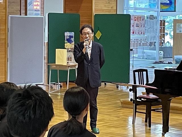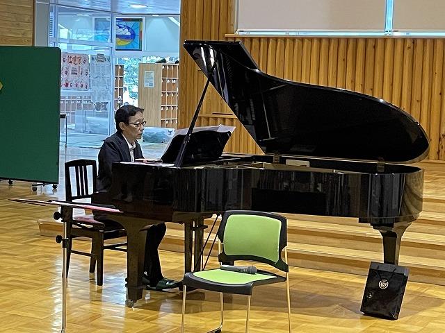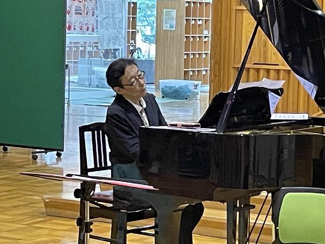 小原さんは、とても繊細で迫力ある「ボレロ」や「エリーゼのために+ねこふんじゃった」などの楽しい曲も披露していただきました。また、お二人による「旅立ちの日に」や「本校校歌」はとても美しかったです。小原さんの伴奏で生徒4人も校歌を歌いました。
