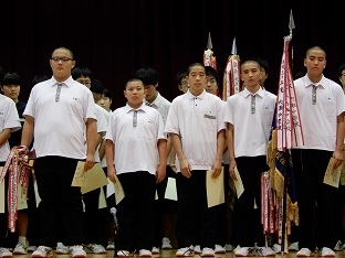 冒頭に新人大会をはじめとした、表彰伝達が行われました。大変多くの生徒が舞台に並びました。