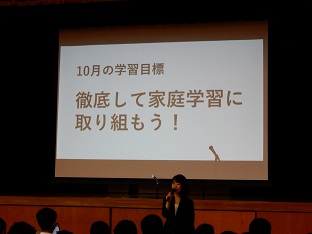 学習担当の廣谷教諭は、10月の学習目標「徹底して家庭学習に取り組もう!」について、その実現の方法を具体的にアドヴァイスしました。