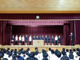 前期生徒会役員認証式も行われました。井上校長は、「前例踏襲にこだわらず、思い切って取組を進めて欲しい」と激励の言葉を述べました。