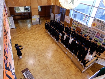 生徒ホールで全体の響きを確認しながら練習を進めています。