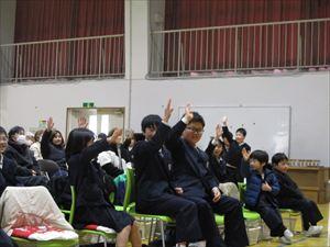 12月18日(木)、児童集会が行われ、冬休みの過ごし方について話し合いました。代表委員会から冬休みのきまりについて説明があり、その後、「ゲームなどは1日にどれだけしてもいい。〇か✕か?」といった〇✕クイズを通して、きまりの内容を改めて考えていました。