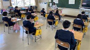 ランチルームは使用せず、教室で一方向を向いて食べています。給食前は職員で机を消毒、配膳時もキープディスタンスを遵守、飛沫による感染を防止するために、黙食(会話せずに食べる)とし、給食後の歯磨きも手洗い場の密を避けるため、一斉ではなく、食べ終わった子から順次行くようにしています。